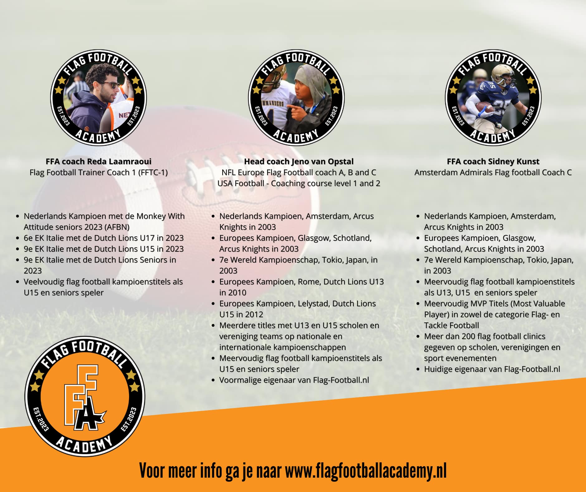 Stichting Flag Football Academy (FFA) is een vooraanstaand flagfootball opleidingscentrum dat zich inzet om spelers, trainers en coaches te laten ontwikkelen. Onze programma’s richten zich op de nationale topsport vanuit de regio’s Flevoland, Utrecht en Amsterdam. Flag Football Academy is een samenwerkingsinitiatief tussen: Jeno van Opstal, Reda Laamraoui en Sidney Kunst.